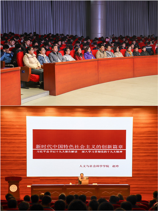 赵玲教授从党的十九次全国代表大会简介及重要意义、十九大报告内容、总书记报告中具有显示度的词语、聚焦道德建设等四个方面对十九大精神作了深入解析。赵教授以 “不忘初心,牢记使命,高举中国特色社会主义伟大旗帜”开篇,阐述了党的十九大的在全面建成小康社会关键阶段、中国特色社会主义发展关键时期的重要历史意义;以十九大报告内容中的新乐章、新成就、新时代、新矛盾、新使命、新思想、新方略、新征程以及新构架阐述了中国共产党人的初心和使命;以发展、梦想、斗争、初心、人民、集体主义、意识形态、主要矛盾、核心价值体系以及社会主义五百年等具有显示度的关键词阐述了党的十九大报告的精髓要义;最后,赵教授以“坚持依法治国和以德治国相结合”为主题,阐述了提高全民族法治素养和道德素质的重要性。赵教授朴实严谨的语言和大量的历史案例分析赢得了台下阵阵掌声。