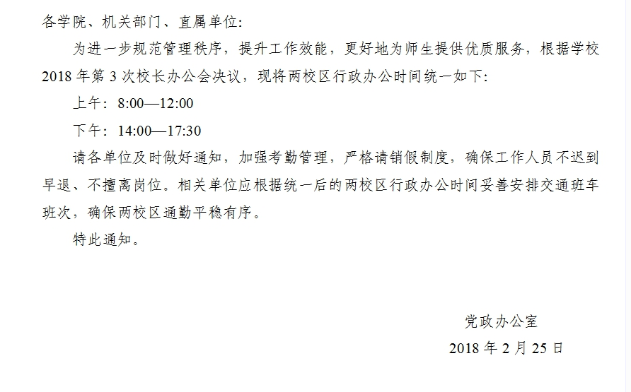 转发学校办公网关于统一两校区行政办公时间的通知