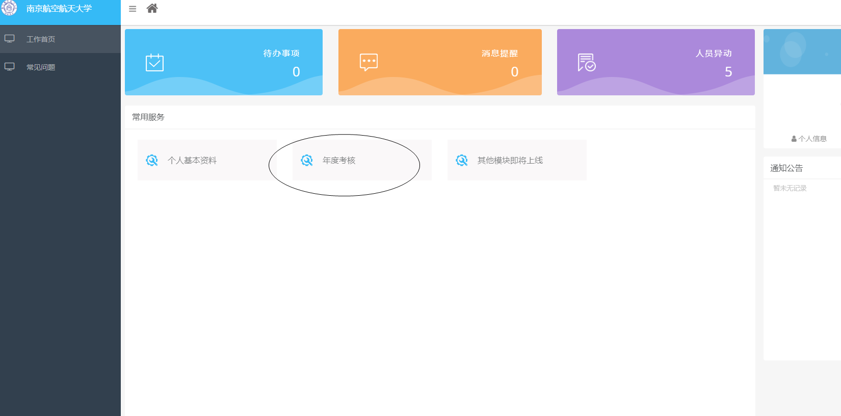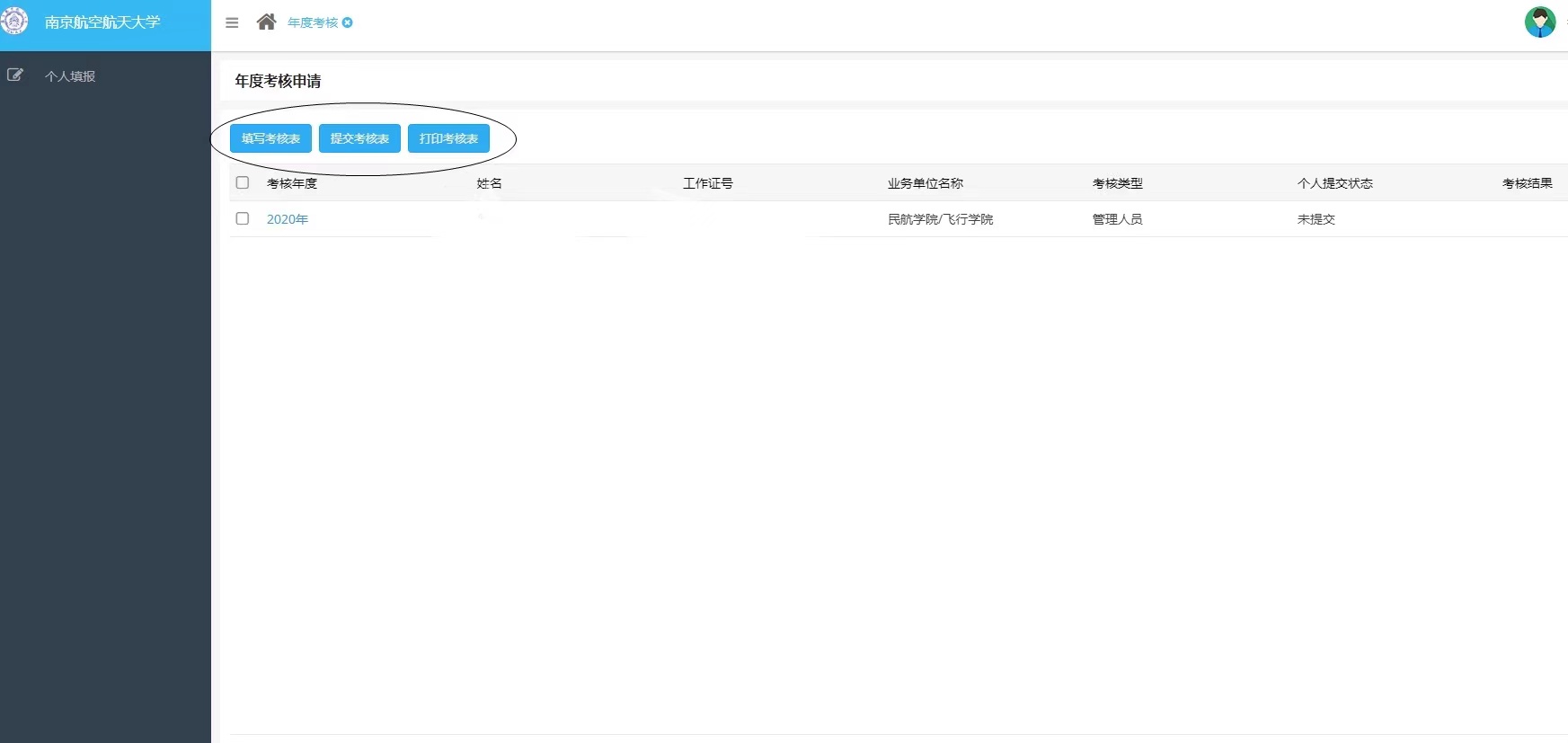 2. 教职工需登陆学校的新版人事管理信息系统http://ehr.nuaa.edu.cn,登录名为职工编号,密码为学校统一身份认证密码),在“年度考核”模块,填写个人年度考核表,并在线提交,并用A4纸正反面打印、签名后交至各系办主任,由系主任签署单位考核评价意见后,统一交至学院。