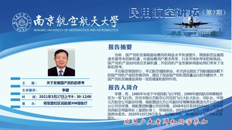 不忘航空报国初心,牢记航空强国使命。本次讲坛指出了民航强国战略下的国产民机产业的发展空间,提出了促进国产民机高质量运行的关键技术,对国产民机发展建设具有一定的借鉴和指导作用。