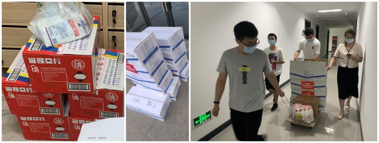学院统一购置免洗洗手液、消毒液和口罩等防疫物资,由党员志愿者为全院所有实验室进行配送。同时,辅导员们也为校内集中隔离的学生配送了生活及防疫物资,转达了学校和学院的关怀。