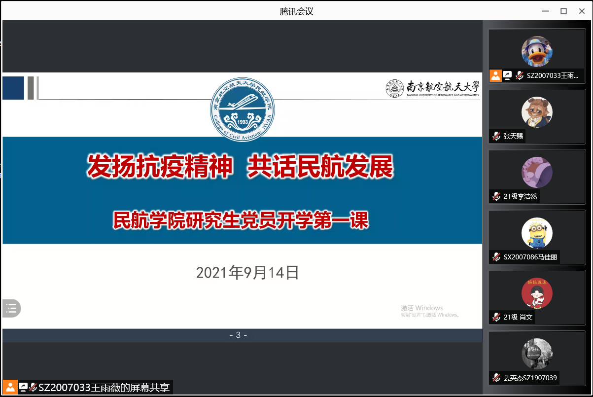 为传达学校疫情防控工作及相关要求,加强新老生的交流互动,同时帮助21级研究生新生形成对学院的认同感、归属感,尽快找准目标定位,走好“研途”,9月14日,best365英国体育在线党委书记刘建成为研究生党员作了题为《发扬抗疫精神 共话民航发展》的党课暨“开学第一课”。会议以线上形式召开,组织员侯美丽、组宣干事童肖、研究生辅导员及全体研究生党员和入党积极分子共200余人参加了会议。会议由学院20级研究生党支部书记王雨薇主持。