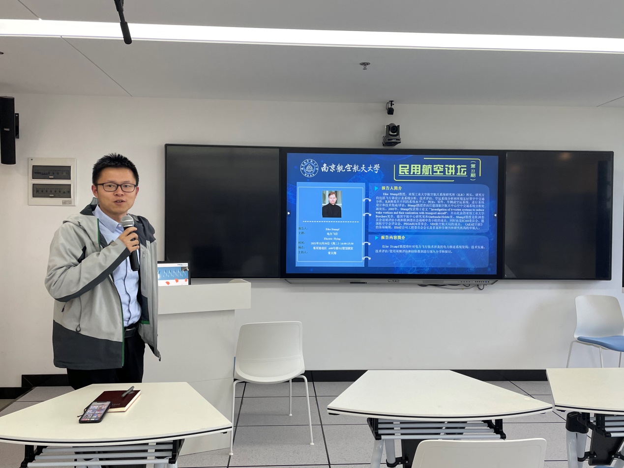 讲座开始前,黄天翔老师对本次讲座的内容进行了简单的介绍。本次讲座中,Stumpf教授针对空中的士(The Silent Air Taxi)项目运行过程中涉及的商业案例、概念设计以及经验教训,进行了深入的分享。