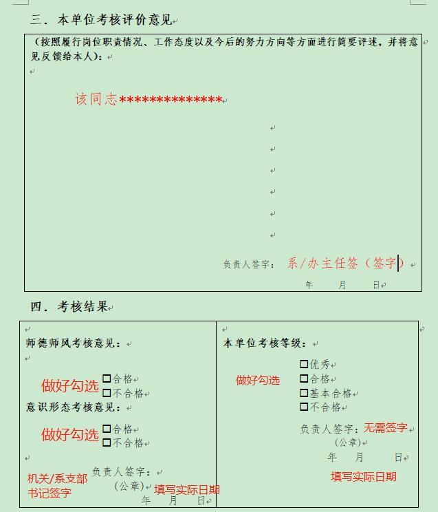 12月26日前 | 收取审核考核表,组织教职工考核述职,进行民主测评。系、办负责人填写考核评价意见后,将教职工个人考核表纸质版、考核结果汇总表(见附件2)电子版交至学院党政办。 1.业务考核:各系、办完成业务考核,并在本单位考核评价意见处填写评价意见,系、办主任签字。 2. 师风师德、意识形态考核:各党支部书记完成本支部教师的师风师德、意识形态考核,并在考核评价意见处填写评价意见:师风师德考核合格/不合格,意识形态考核合格/不合格。 3.填写要求参照附件1,日期按照实际考核日期填写即可。 | 各系、办 |