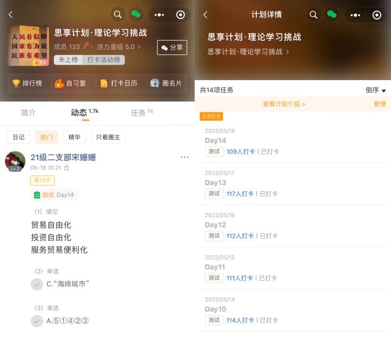 据统计,本次活动有效参与人数127人,完成14天打卡共计109人,占比86%,“小打卡”每日回答问题动态总计1700+