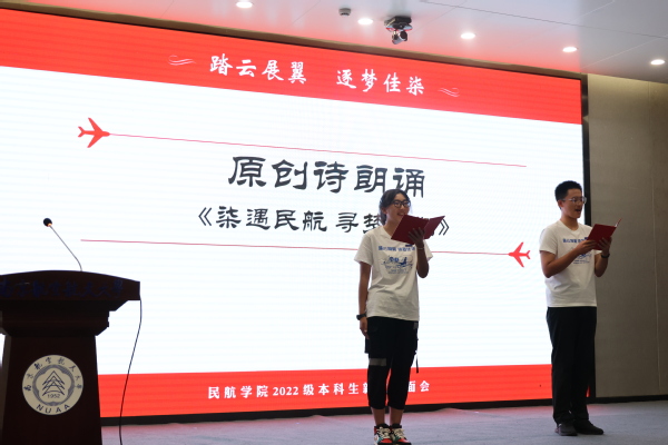 2022级新生代表献上原创诗朗诵《柒遇民航 寻梦翱翔》,在朗诵同学激情饱满的诵读声里诉说着同学们对追梦的信念。