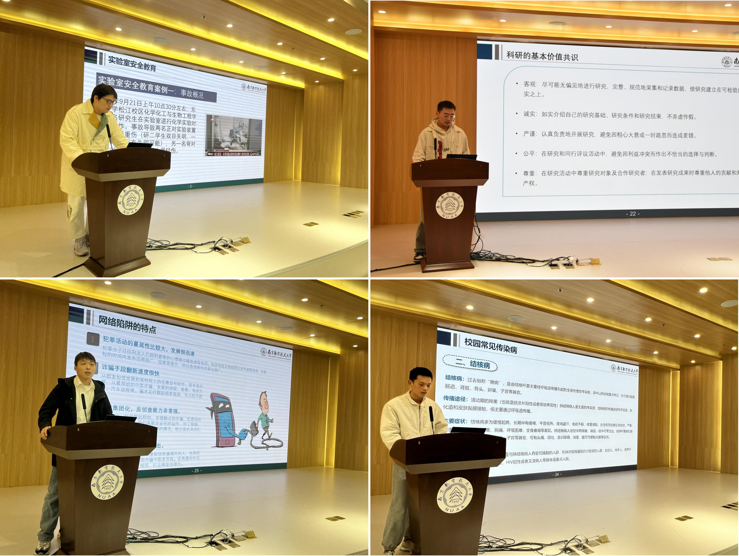 首先,四位学生代表就七个主题模块,从真实案例入手,与同学们共同学习并分享心得体会。余嘉庆同学为大家讲解了实验室安全教育和校园防诈骗教育的相关案例,提醒大家在面对诈骗时提高警惕、学会甄别;康嘉伟同学从保密要求、学术诚信、科研基本价值等方面进行了说明,引导同学们保守安全机密,恪守学术诚信;汪一文同学介绍了网络陷阱的特点及如何鉴别网络陷阱、常见骗术,为大家详细介绍了网络陷阱识别公式和五招补救措施;牧琳龙同学介绍了校园常见传染病及传染病防控典例,重点梳理了预防传染病的措施。
