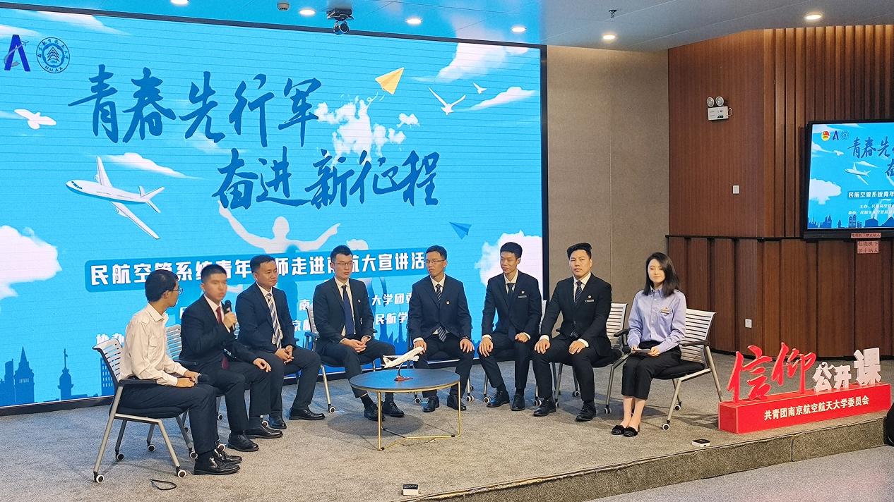主题分享结束后,本次活动的主持人,江苏空管分局管制运行部李雨吟邀请全体青年讲师一同上台开展现场访谈交流。同学们热情高涨、踊跃提问,青年讲师们详细解答了学生所关注的民航领域各类热点问题,帮助广大民航学子更好地理解和掌握民航相关的科学知识和行业动态。