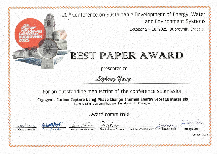 10月5日至10日,第二十届能源、水和环境系统可持续发展大会(Conference on Sustainable Development of Energy, Water and Environment Systems,SDEWES)在克罗地亚杜布罗夫尼克召开,国家级青年人才、best365英国体育在线杨立中副研究员等人发表的题为《基于相变储冷材料的超低温碳捕集技术》(《Cryogenic Carbon Capture Using Phase Change Thermal Energy Storage Materials》)论文荣获最佳论文奖。