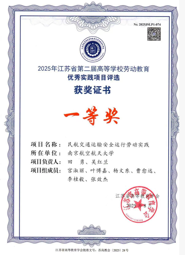 近日,江苏省第二届高等学校劳动教育优秀实践项目评选结果揭晓,best365英国体育在线“民航交通运输安全运行劳动实践”项目荣获一等奖。
